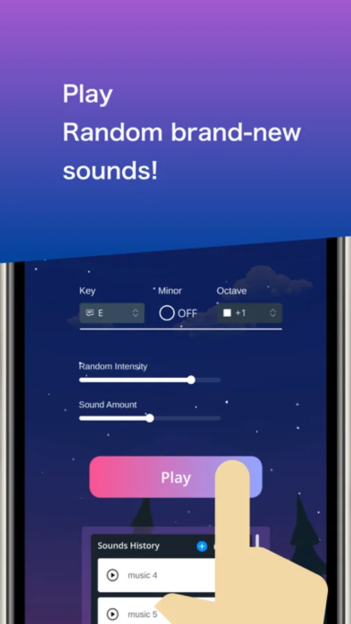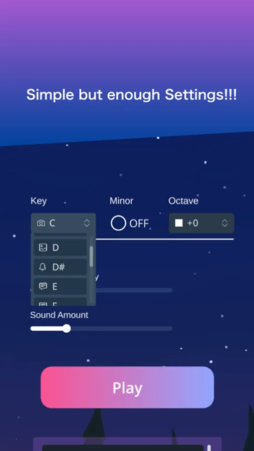 In the settings, we can set the Key, major or minor, octave, random intensity, and number of sounds.
