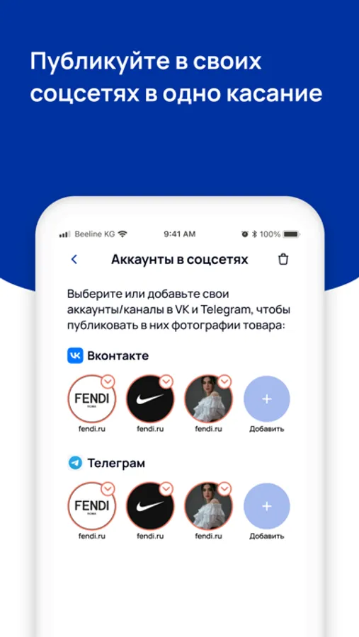 2. Одним кликом публиковать свои товары в аккаунтах в соцсетях ВКонтакте и Телеграмм