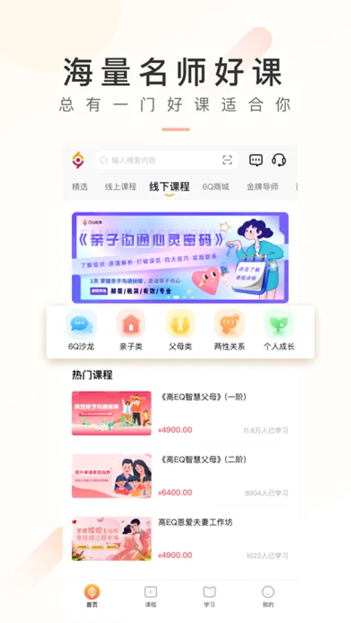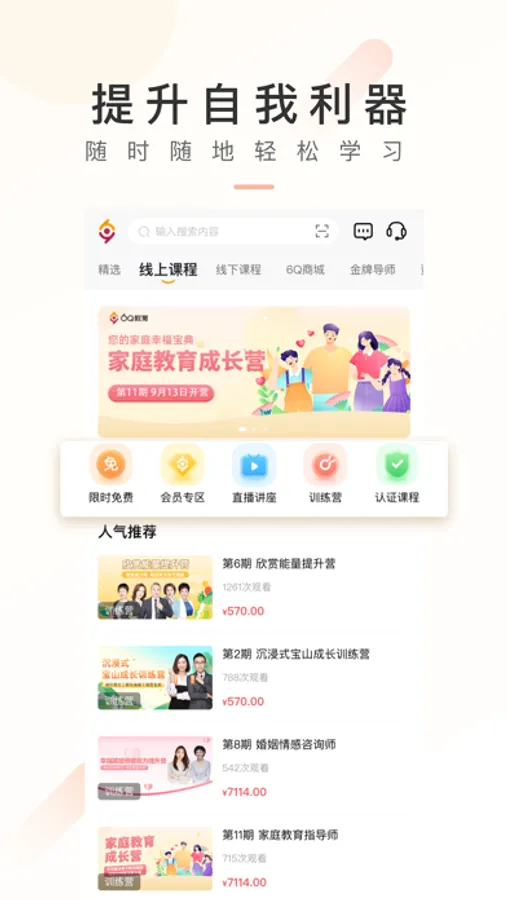 平台拥有家庭教育、情绪管理、自我成长、情感关系、心理疏导等多方面课程;