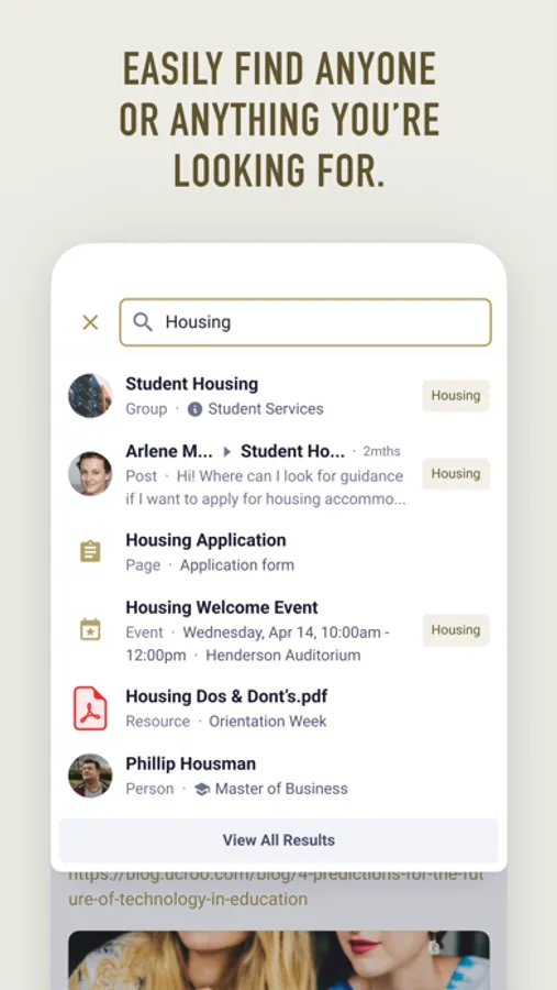- Search staff, peers, systems, resources, and more