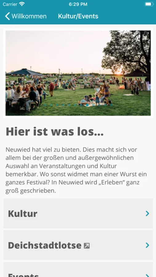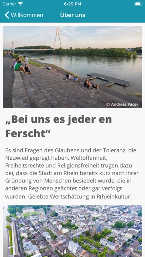 Die Stadt Neuwied, schön an der Mündung der Wied in den Vater Rhein gelegen, bietet ein unglaublich, vielfältiges Angebot an Freizeitaktivitäten: Sei es Einkaufen, Flanieren, Museumsbesuche, Veranstaltungen, Märkte, Stadtführungen und Aktivitäten, hier werden Kulturliebhabende genauso fündig wie Tagesgäste, Touristen, Bürger und Bürger auf Zeit. Diese Vielfältigkeit macht die Stadt lebendig und diese Lebendigkeit wird durch diese informative App wiedergeben.