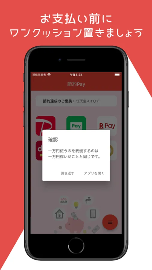 Pay系のアプリを開く前にワンクッション置くことで、節約の意識を促進させます。
