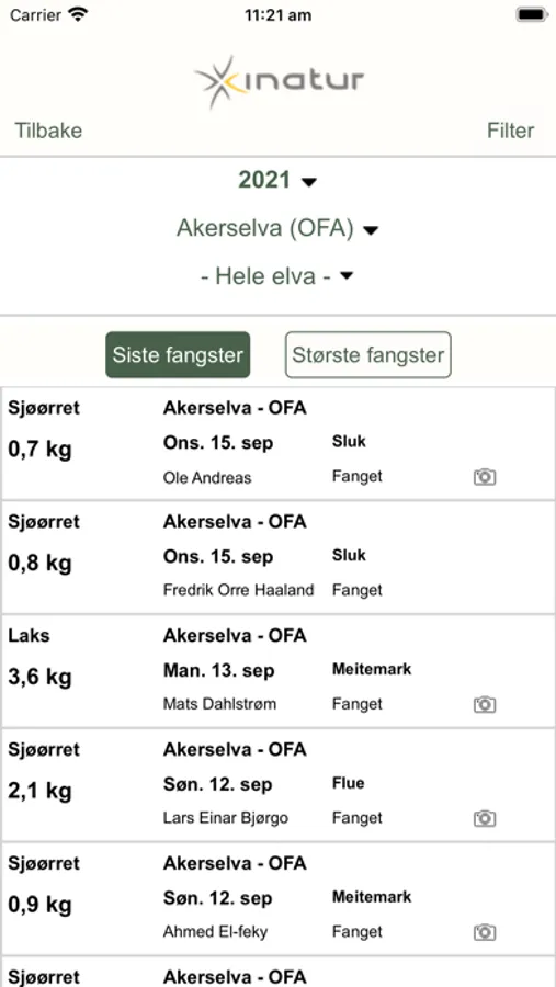 Inatur FangstApp lar deg rapportere fangst direkte fra elva. Har du ikke mobildekning lagres rapporten lokalt og du kan sende den inn senere når du kommer tilbake til dekningsområdet. Appen inneholder også en komplett laksebørs der du kan se hva som blir fanget i alle elver der fiskekort selges hos Inatur, søke og sortere på kriterier, drille ned på vald eller se aggregerte summer over tid.