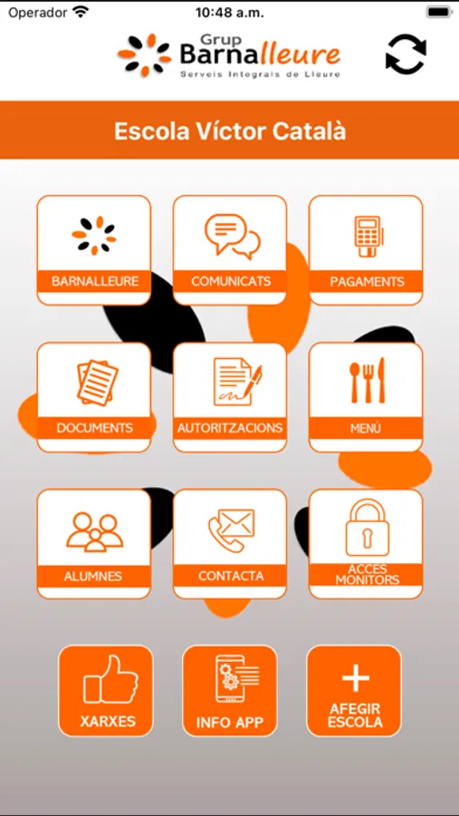 App de Barnalleure, una empresa amb 25 anys d'experiència en el camp de la restauració per a col·lectivitats i càtering en centres d'ensenyament així com a proveïdors activitats extraescolars adaptades a cada cas. L'aplicació permet una comunicació directa entre el Barnalleure i els usuaris. El menú consta amb diverses opcions: qui som, comunicats, pagaments, documents, autoritzacions, menú menjador, alumnes, contacta i accés monitors. A la barra inferior hi ha les seccions: xarxes, Info App i afegir escola.