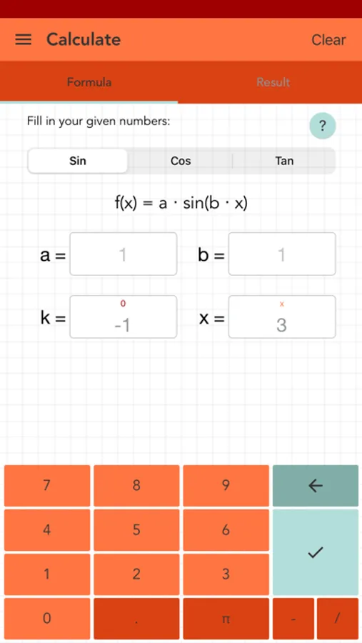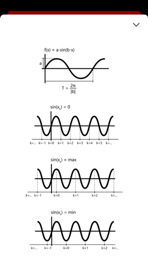 This explains the behavior of the basic sine, cosine and tangent function. You can modify the amplitude and the frequency of the function. In addition you can enter an x value or a periodical step for the solution you require. The app shows every important calculation, provides an info image and displays the graph.