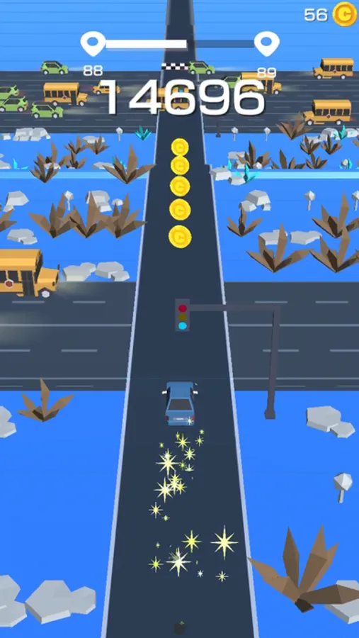 This game is level based game. You have to simply tap and hold on the screen to move forward with your car. Release to stop. Use your timing to dodge the traffic smartly and get to the finish line without crashing. You can use the coins available to collect in every level to buy new random cars or watch an ad to unlock a random car. Master your timing with this game.