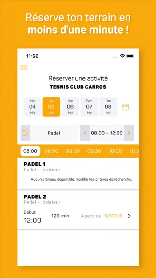 Fini la corvée de réservation ! Avec l'application tu n'as plus qu'à accéder aux créneaux disponibles et à en choisir un. Le club recevra alors automatiquement ta réservation.
