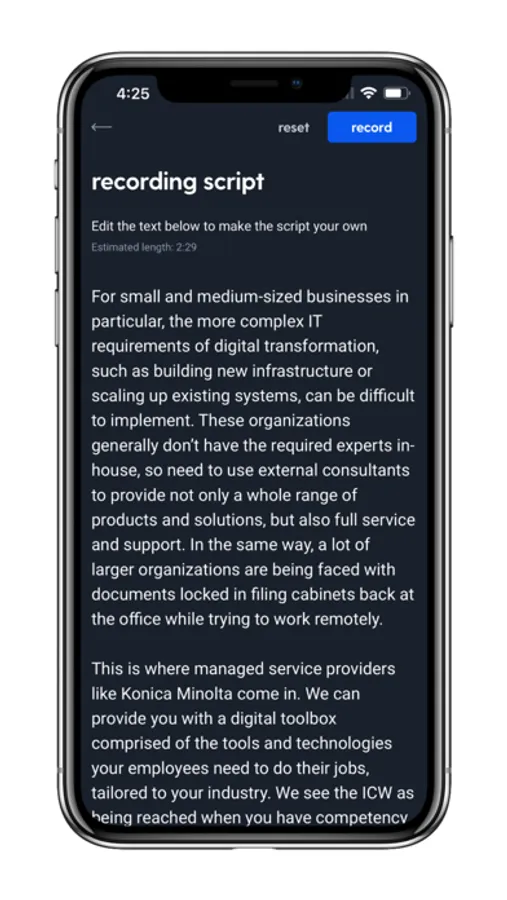 With a proprietary, built-in teleprompter, the KM100VIDEO companion app makes it easy to record short videos on mobile phones or tablets. This app also provides access to industry-specific, best class video scripts, which pair directly to the proprietary teleprompter. Users can also create their own custom video scripts from scratch and record immediately.