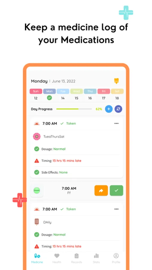 2. Pill tracker with a history of all medications, skipped, and regular intakes.