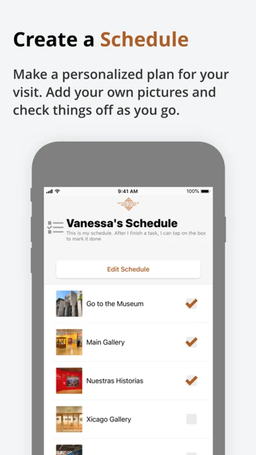 Schedule: A customizable checklist to mark off what you will do during your visit.