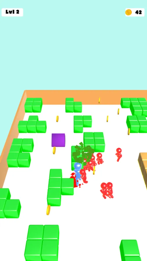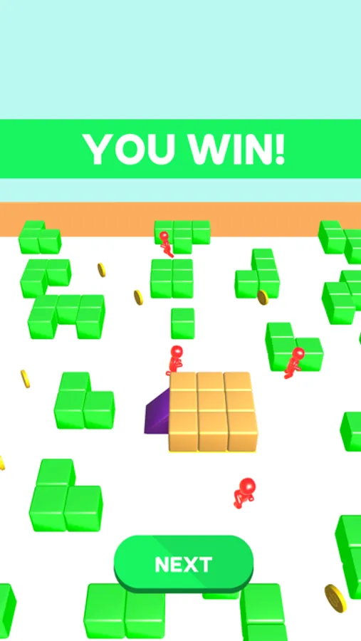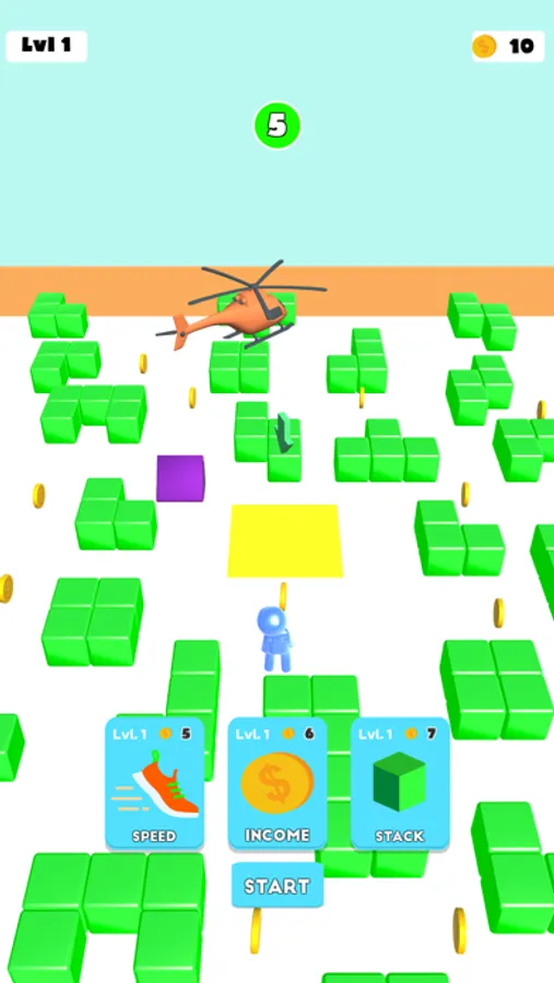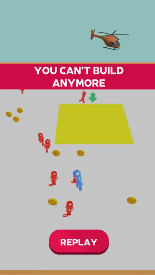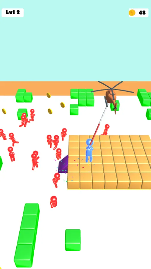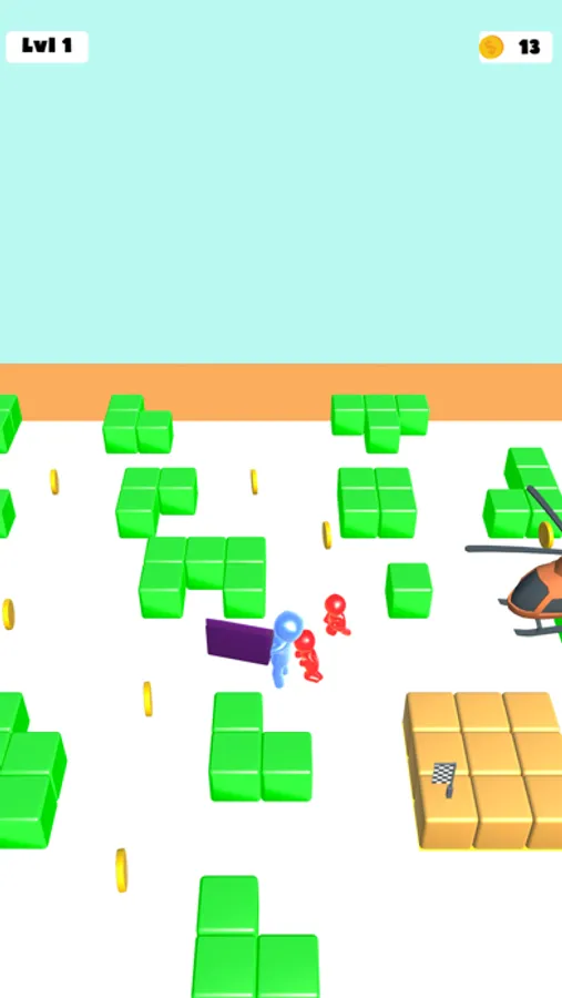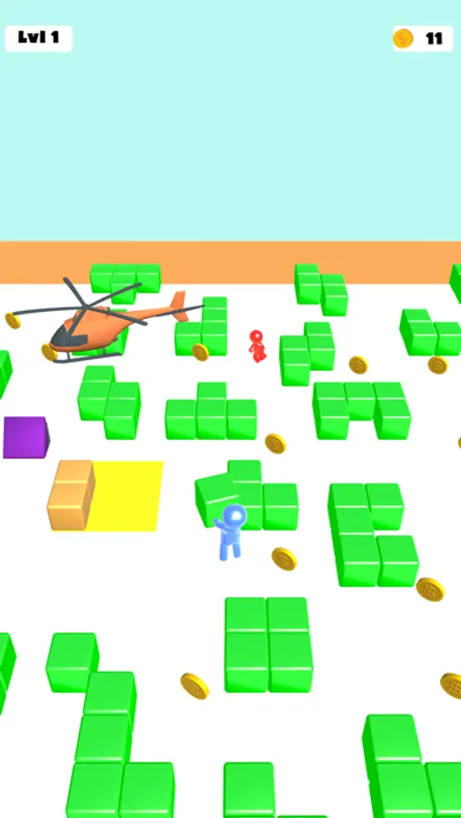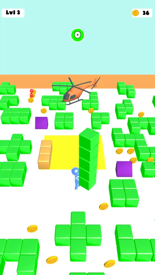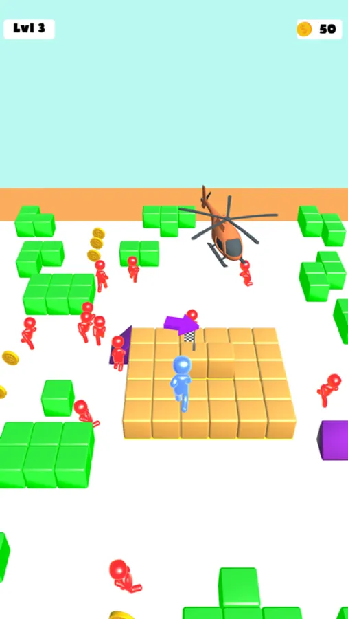 Stack the cubes and build the floor until you reach the helicopter. Escape the enemies.