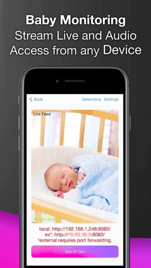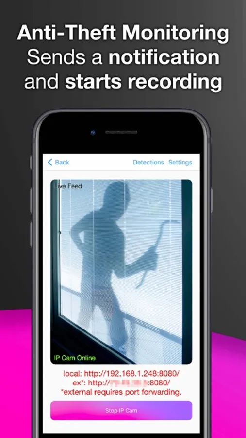 Phone IP Camera lets you turn your device into a remove camera (IP Cam) in order to surveil, spy and check whatever you want, i.e. your house, your pet, your baby and similar.