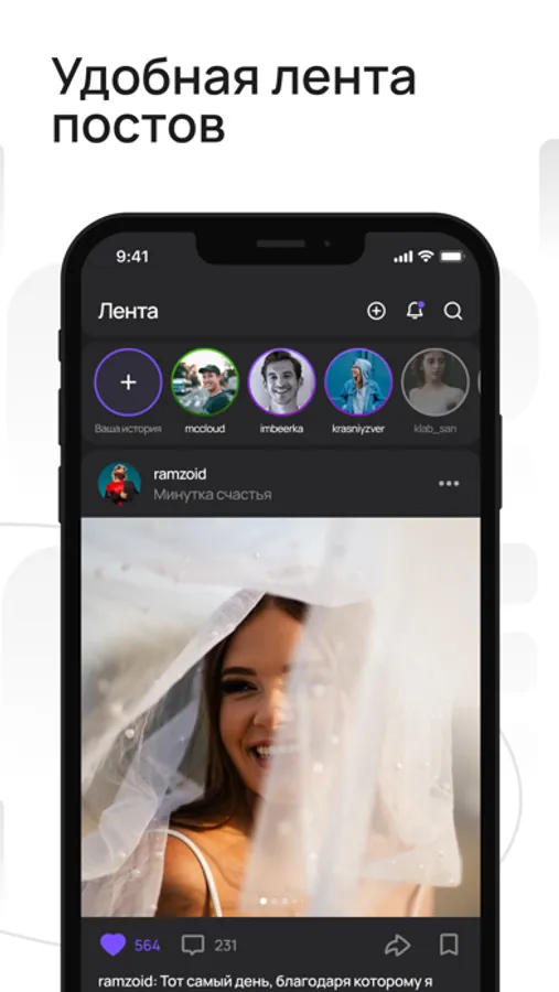 * Публикуйте фото и видео с моментами из своей жизни. Делитесь с другими пользователями в ленте и сториз. Удобно и привычно, как обычно.