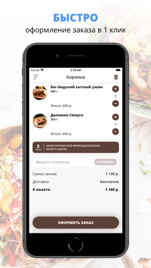 Скачивайте наше приложение, оформляйте заказ и наслаждайтесь любимой едой, где бы Вы ни были! Приятного аппетита!