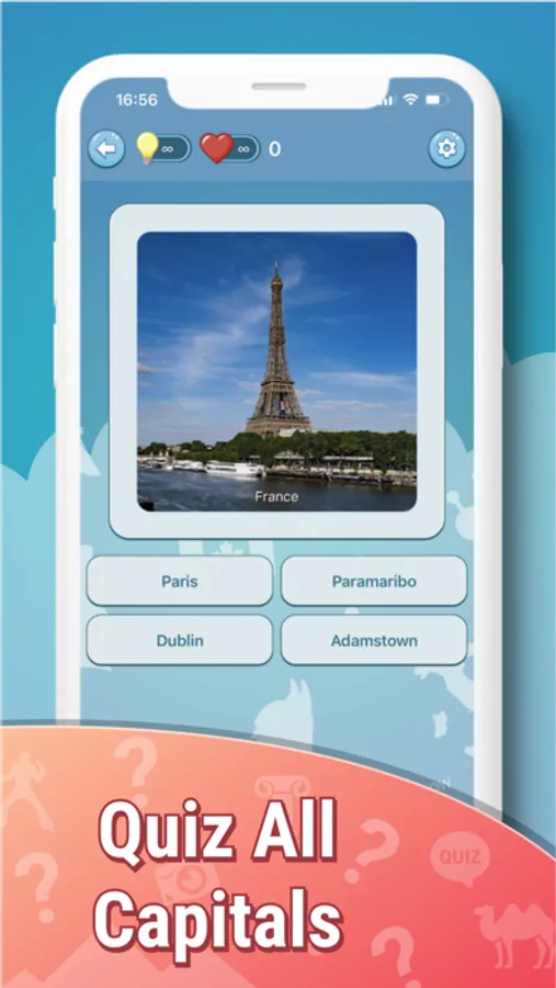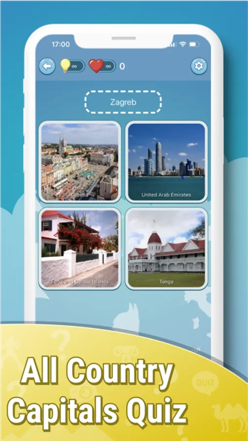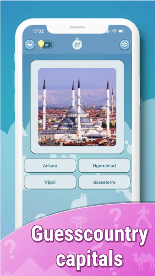 ots of free mini game of interesting fun quizzes in our application for the development of intelligence, brain, general knowledge and your IQ, Guess all the city capitals of countries!