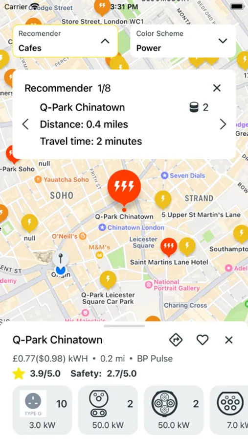 Currently the app provides information about chargers in the US and UK. It allows drivers to quickly identify the optimum charge point by comparing and ranking them based on travel time, expected recharge time, the types of amenities which are available, the safety of the area and how busy chargers are.