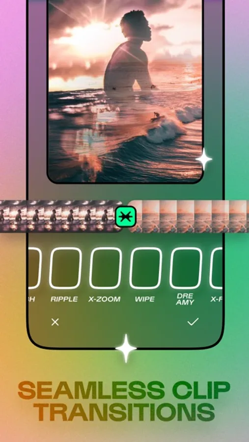 Play around with a selection of 32 Filters and edit to your heart’s content. Use our clip selector for precision editing: Trim, Flip/Rotate, Speed up and lower FPS for a visually stunning, cinematic feel. Finalize your edits with powerful adjustment tools like: Brightness, Contrast, Vibrance, Chroma, Grain, Clarify, Glow, Exposure, Highlights, Shadows, Temp, Tint.