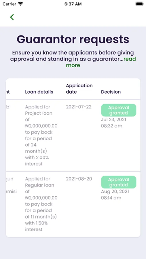 Users can check their savings and loan balance, loan and savings breakdown, history of active, pending and completed loan, refunds, make complaints, grant or decline loan request guarantor ship application and view members birthday.