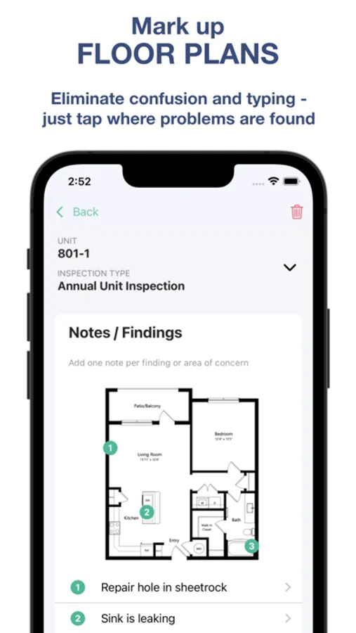 - Include unit floorplans and property maps to record where an issue was found with pinpoint accuracy