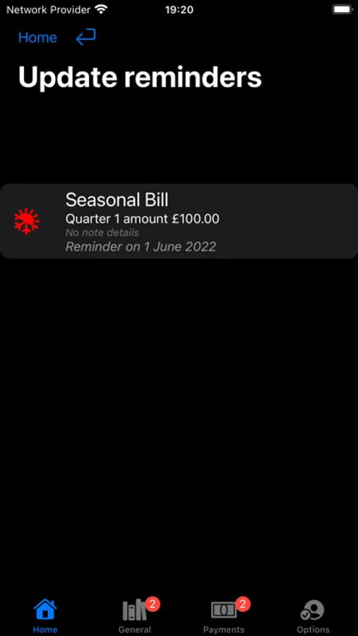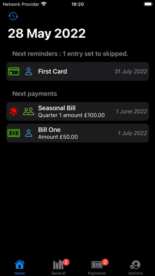 The summary (Home) screen lists the entries that are up-and-coming, with their due dates.