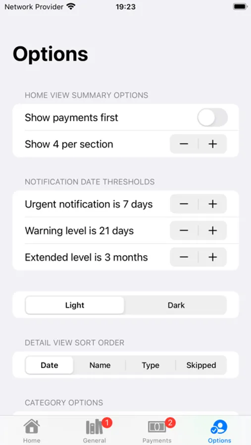 - whether to show the payments or general miscellaneous entries first on the summary (Home) screen.