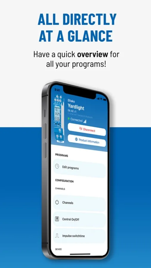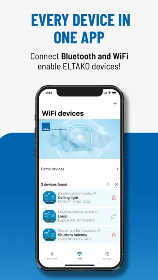 With our app you can configure Bluetooth and WiFi enabled ELTAKO devices. The modern user interface follows the motto "The simpler the operation, the more convenient the use". By regularly updating and constantly expanding product compatibility, Eltako Connect remains the status-quo of technological progress.