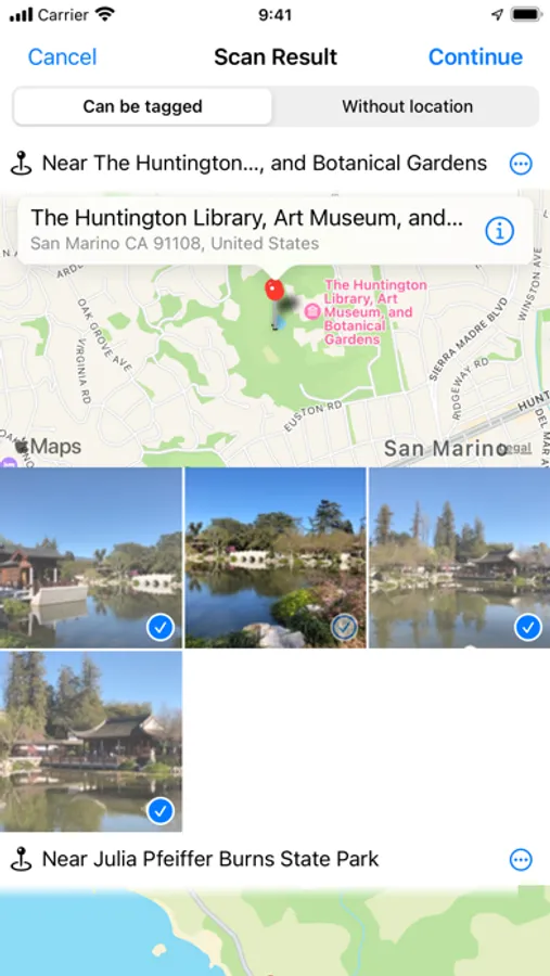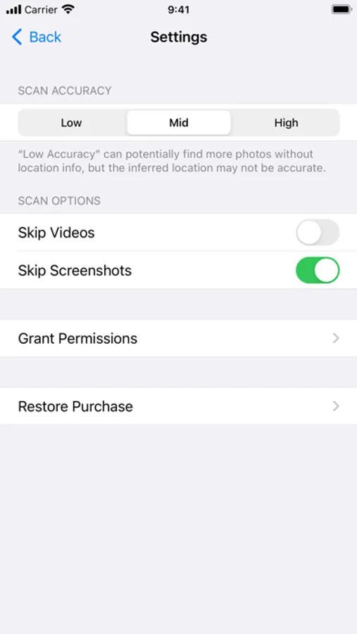 - Scan photo library to find items without location information, such as photos and videos created through third-party apps.