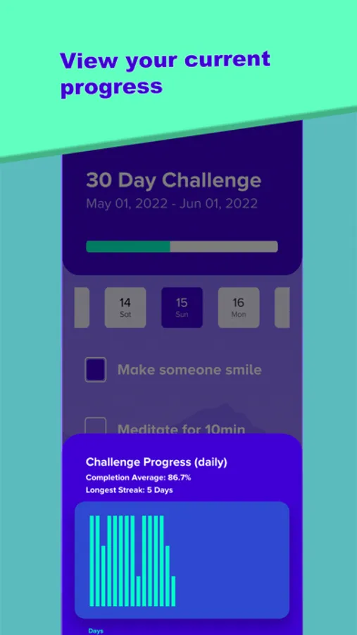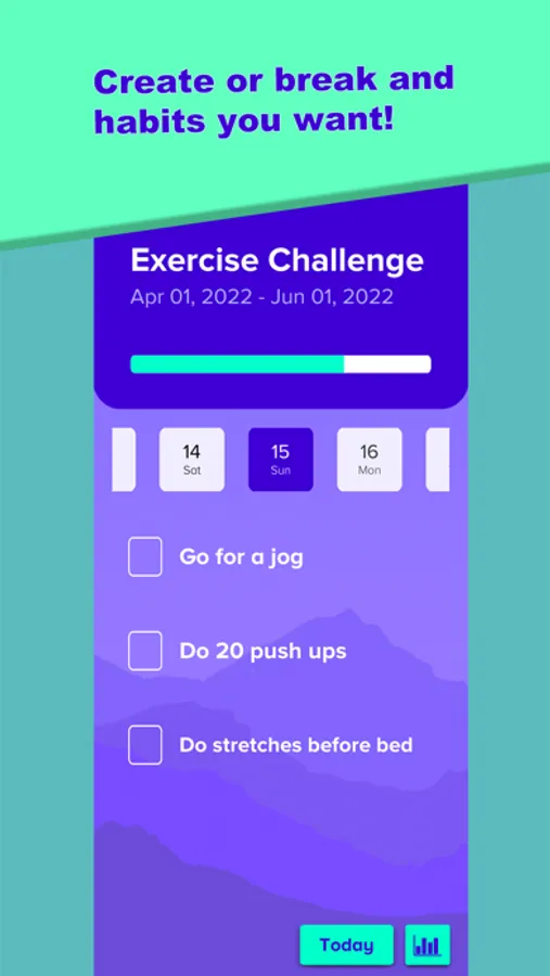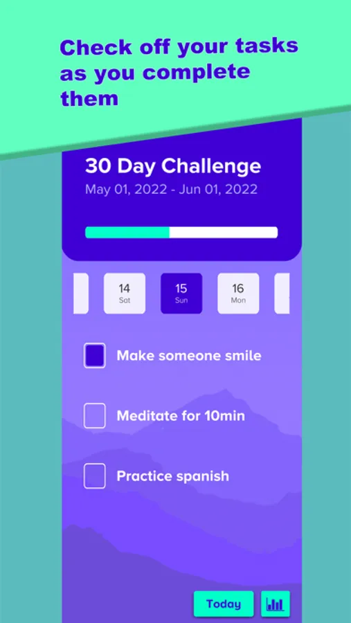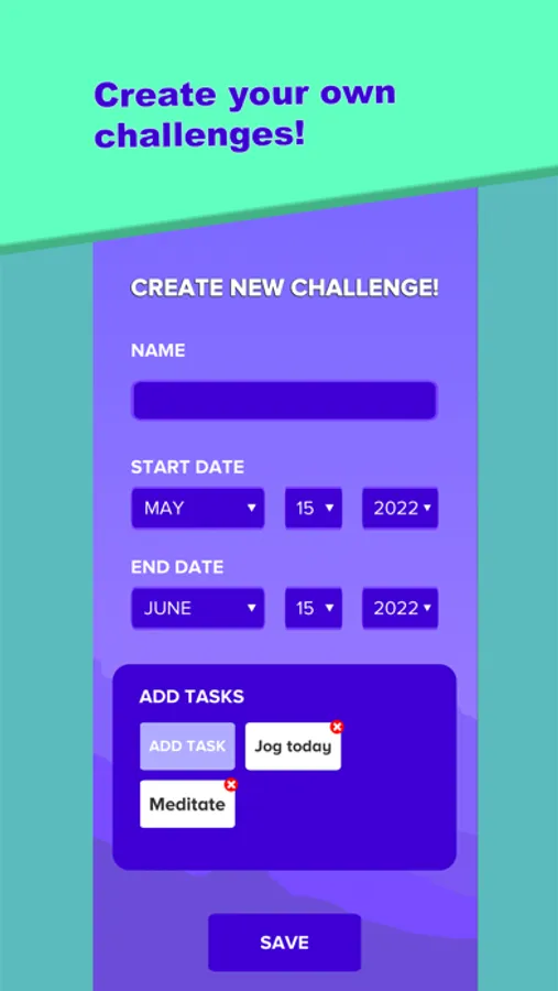 Create your own dated challenges with tasks you wish to complete daily. Easily open up the app each day to check off your completed task, or to check what you still want to accomplish that day.