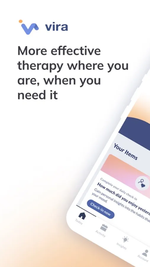 - Allow your therapist to remotely monitor your reported mood and other Vira data to aid in providing care between visits. (Remote Patient Monitoring)