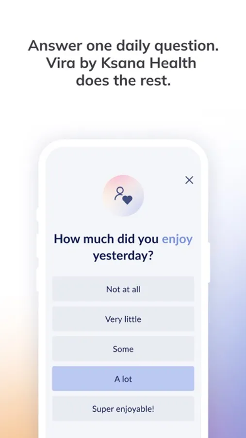 Discover how unconscious behavior patterns can affect your mood. Vira uses AI and machine learning to generate insights by building a personalized model of your daily behaviors using just the sensors in your smartphone. Answer one daily question. After just a few days of daily use, Vira will start sharing personalized insights on how to improve your mood.