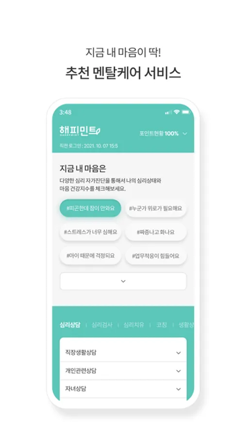 해피민트는 회사가 지정한 EAP(Employee Assistance Program, 근로자지원프로그램) 예산을 포인트로 전환하여 임직원들이 심신케어 증진을 위한 서비스(심리상담, 코칭, 심리검사, 웰니스 프로그램 등)를 포인트를 통해 언제든지 편리하게 이용 할 수 있도록 구축된 온라인 플랫폼을 모바일로 제공합니다.