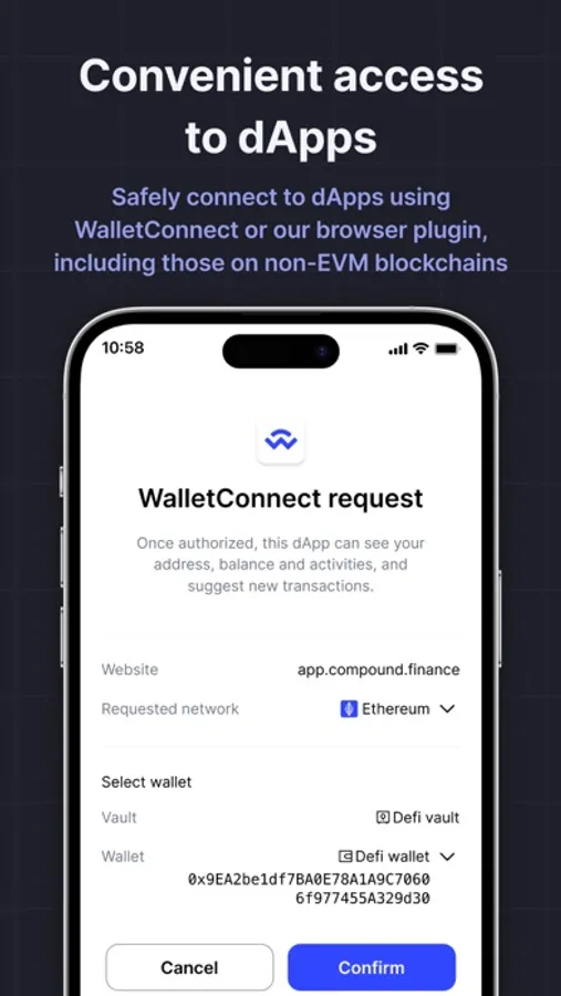 - Enables easy connection to DeFi (Decentralized Finance) via WalletConnectV2 or our browser plugin.