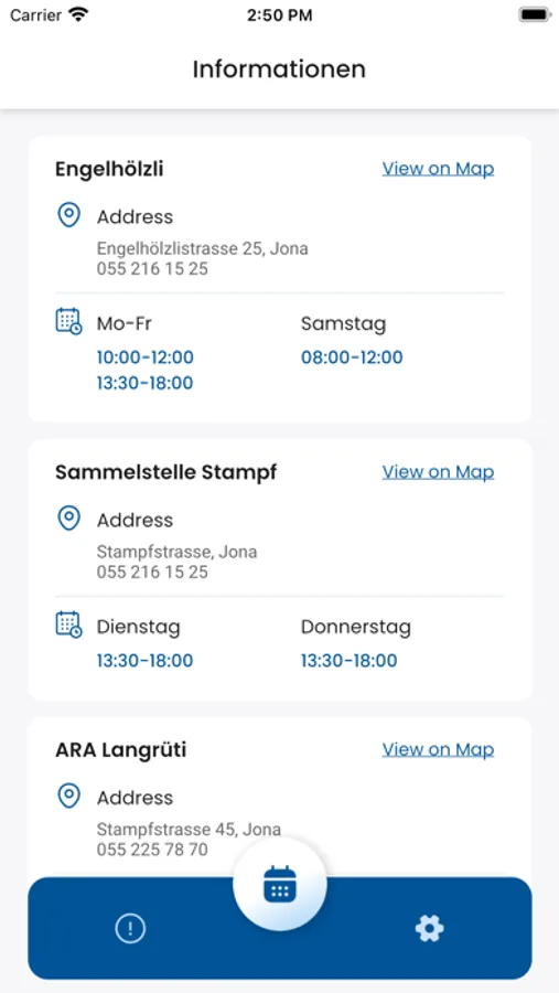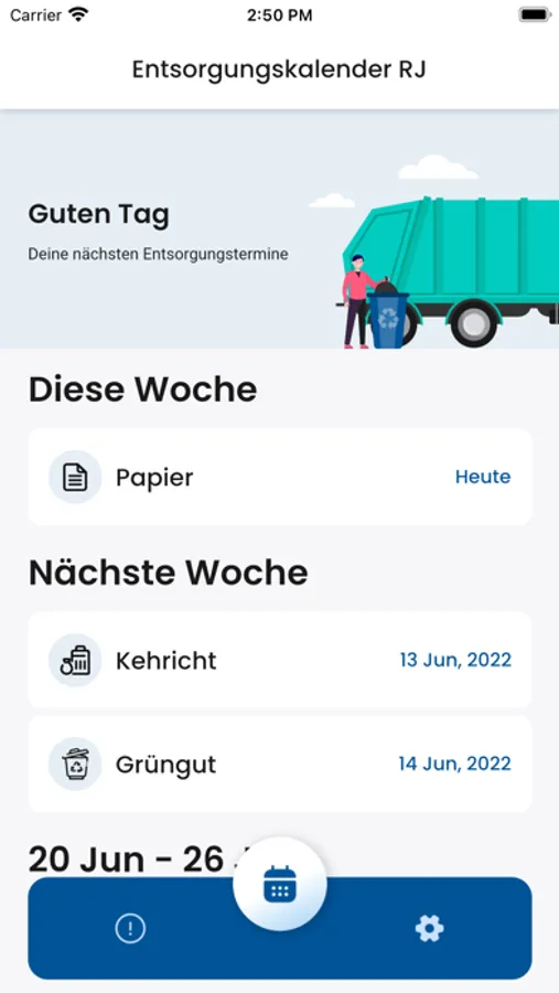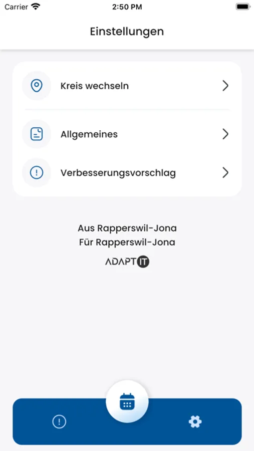 Der Digitale Entsorgungskalender für die Stadt Rapperswil-Jona erinnert Sie mit Push-Nachrichten an das Deponieren des Mülls in Ihrem Kreis. In der App werden die Entsorgungstermine der nächsten zwei Wochen sowie auch die Öffnungszeiten der Entsorgungsstellen dargestellt.