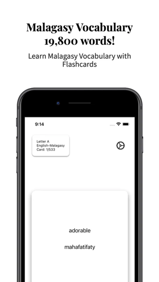 Learn or improve your Malagasy vocabulary with this flashcard app. Try to guess the translation of the word or expression. A tap on the card and the translation appears under the word instantly. You wil learn Malagasy vocabulary at your own pace. A swipe on the right or the left to show the next word.