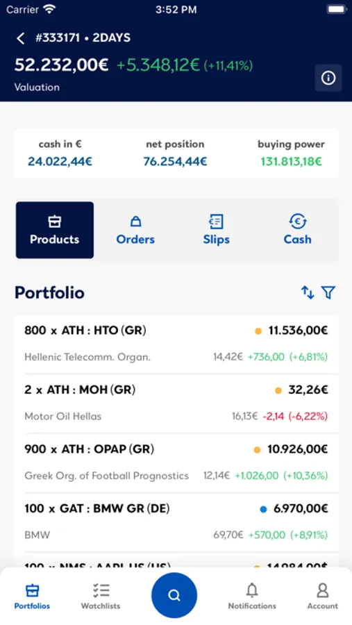 Eurobank Trader’s mobile app users, have the ability to view their assets (portfolio, cash amounts), their orders and trades, their statements, to Subscribe to real time price data, to exchange messages with Eurobank Trader support team, etc.