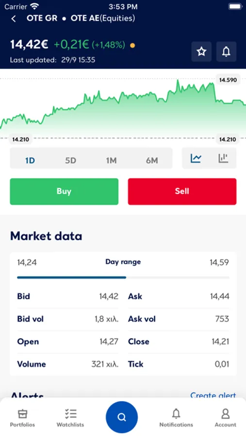 Users of Eurobank Trader App can monitor market through several tools -even if they are not currently login, due to push notifications they set for themselves.