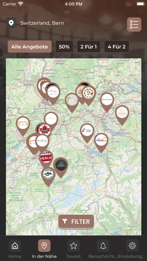 » Lust auf ein Schnäppchen? Dank der praktischen «In der Nähe» Funktion, siehst du sofort wo die nächstgelegenen 2 für 1 Angebote sind.