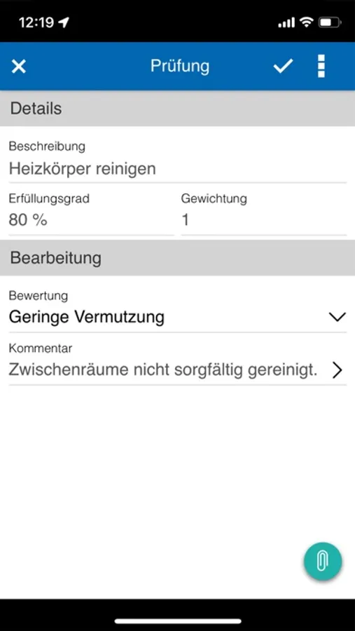 In jeder Prüfung haben Sie die Möglichkeit, zusätzlich zur Bewertung weitere Extras hinzuzufügen. Diese können Fotos von den einzelnen Kontrollschritten sein oder zusätzliche Informationen in Textform. So sind auch komplizierte Sachverhalte stets optimal dokumentiert.
