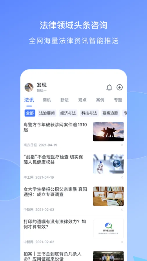 ● 法律头条:智能推荐算法将全网海量法律资讯分类整理推送