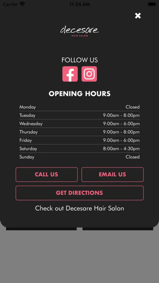 The Decesare Hair Salon booking app allows clients to log on and make bookings online under their own profile 24/7. Clients can track loyalty points as well as looking at historic and future bookings and get directions for their favourite salon.
