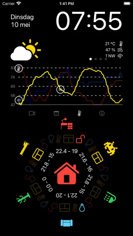The circle / grid with icons on the home view shows a color coded status of the rooms of the home: red when a door is open, yellow when a window is open, orange when the heating is on, cyan when lights are on and green when nothing is on.