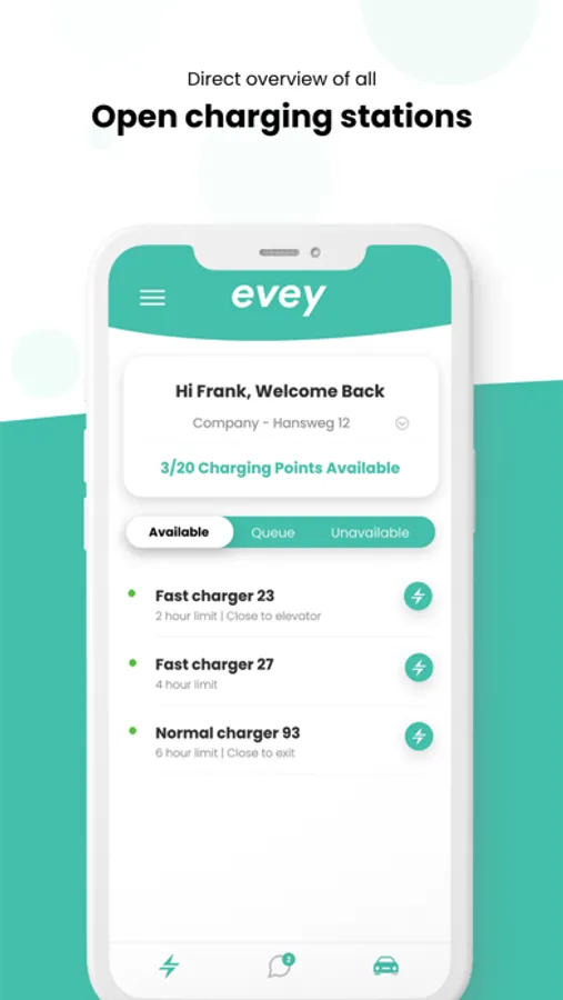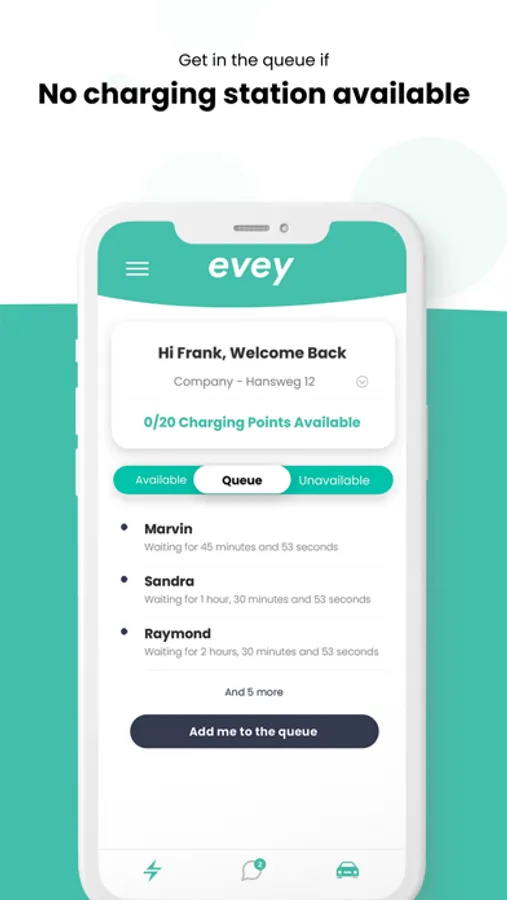 Get instant insight into the available charging stations or use the queue which shows an average waiting time within your company parking.