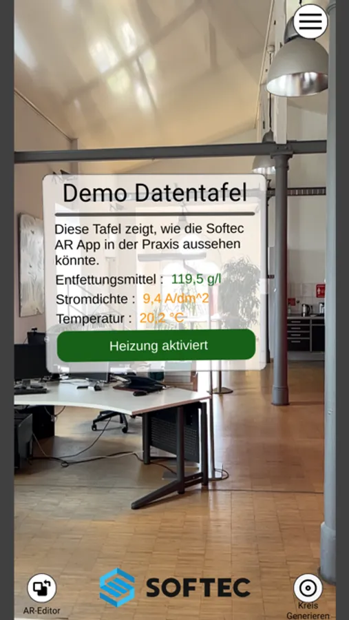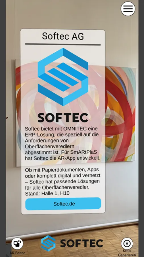 Um die Funktionen der Softec AR-App bereits vor Ihrem Messebesuch zu testen, gibt es in der App einen Messevorschau-Modus. In einem Ring um das Smartphone werden Datentafeln der Projektpartner eingeblendet; Sie können Buttons auf einzelnen Tafeln antippen, um auf die Website des jeweiligen Projektpartners zu gelangen.