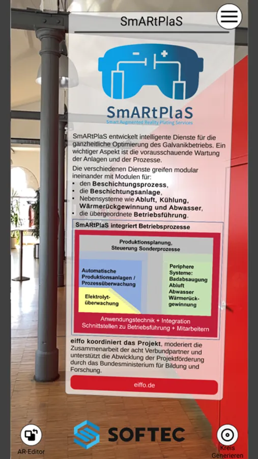 Die App wurde im Rahmen des Forschungsprojekts SmARtPlaS (Smart Augmented Reality Plating Services) entwickelt und soll eine vorausschauende Wartung in der Produktion ermöglichen. Wichtige Informationen werden auf einen Blick an der passenden Stelle sichtbar gemacht.