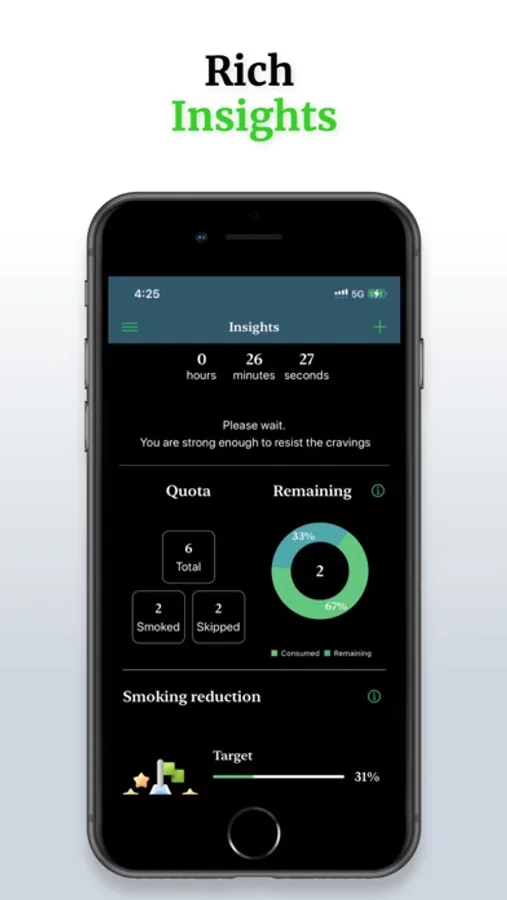 ◈ Gradual Quit Insights - Provides insights such as your progress towards the quit date, Smoke Timer to maintain a minimum interval between smoking sessions, daily quota and consumption, money savings, milestones, and more.