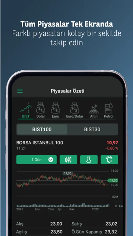 Trader uygulamamız ile Araştırma ekibimizin hazırladığı analiz ve önerilerden yararlanabilir, piyasa verilerini izleyebilirsiniz. Uygulama üzerinde istediğiniz sembole alarm ekleyebilir, yatırım kararlarınızı kolayca işleme dönüştürebilirsiniz.