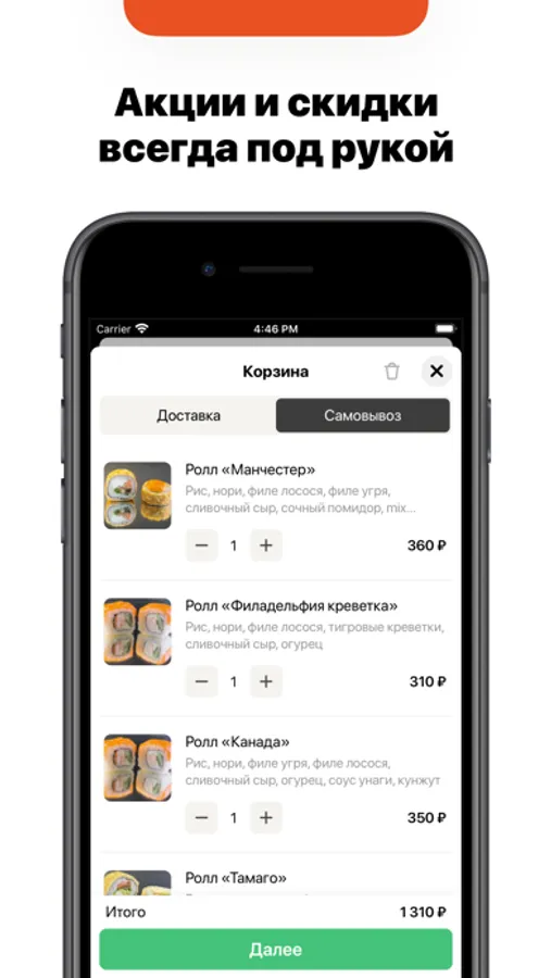 С нами быстро и вкусно: доставляем по всему городу в течение часа, а по предварительному заказу — еще быстрее.