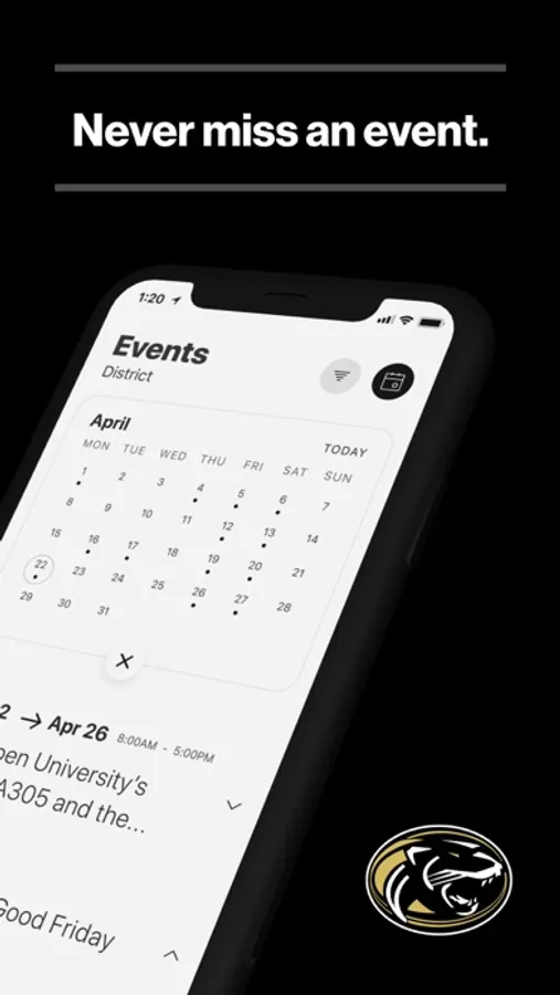 The event section shows a list of events throughout the district. Users can add an event to their calendar to share the event with friends and family with one tap.