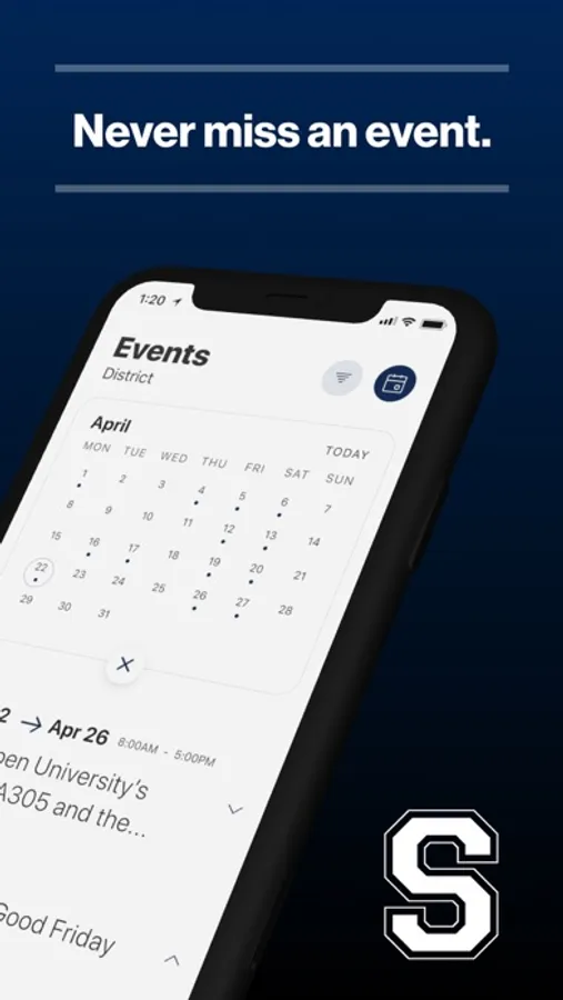 The event section shows a list of events throughout the district. Users can add an event to their calendar to share the event with friends and family with one tap.