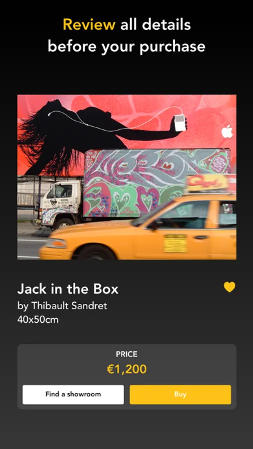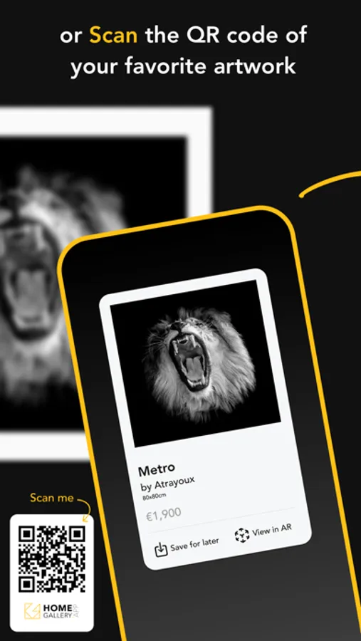 Discover new artists and artworks in-app or scan the Home Gallery QR code of an artwork you like directly, online or in a showroom. Your favorite artist or gallery is not using Home Gallery yet? Tell them about it to make sure they give you the best discovery experience for your next purchase.